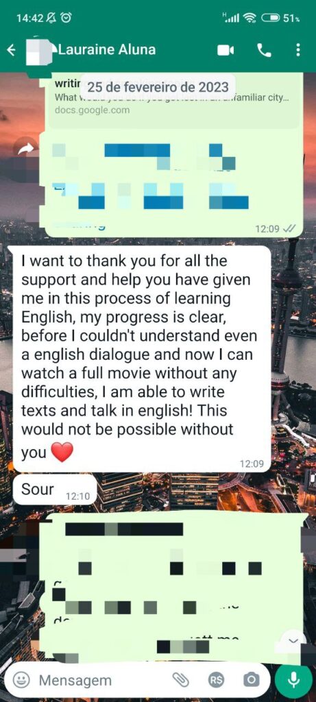 Eu quero te agradecer por todo o suporte e ajuda que você me deu nesse processo de aprender inglês, meu processo é claro, antes eu não consegui entender se quer um diálogo em inglês e agora eu consigo assistir a um filme inteiro sem nenhuma dificuldade, eu sou capaz de escrever textos e conversar em inglês! Isso não seria possível sem você.
