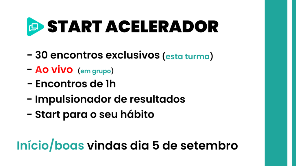 Start Acelerador: 30 dias de aula ao vivo (em grupo) para te ajuda com o hábito e a constância + gravação de todas as aulas